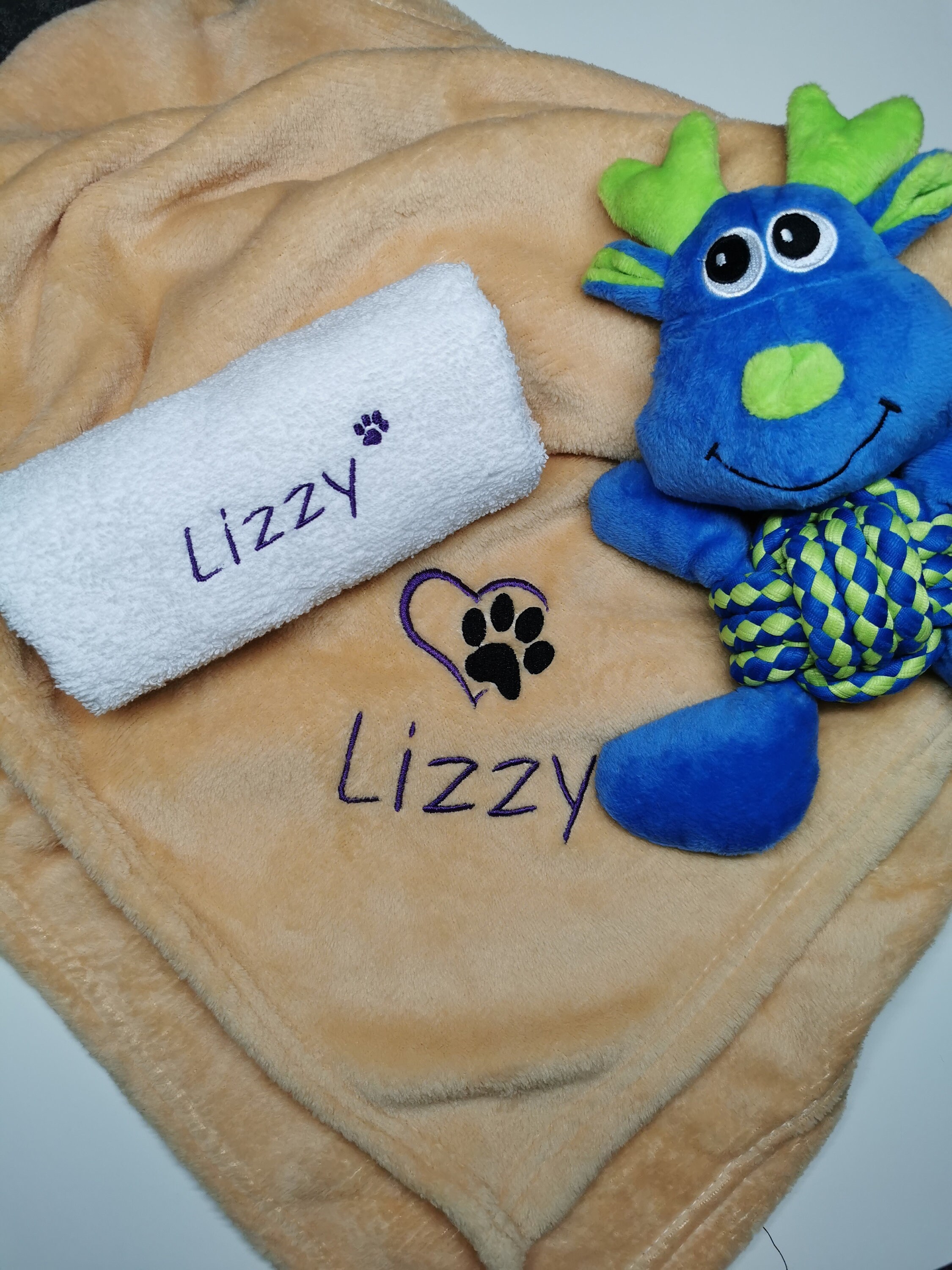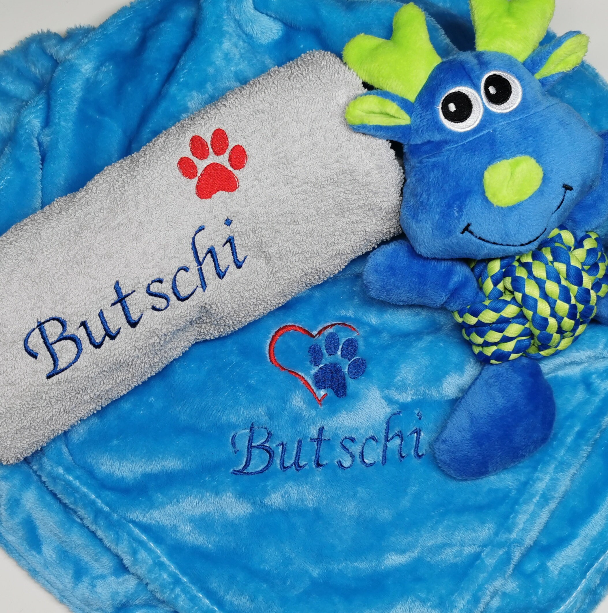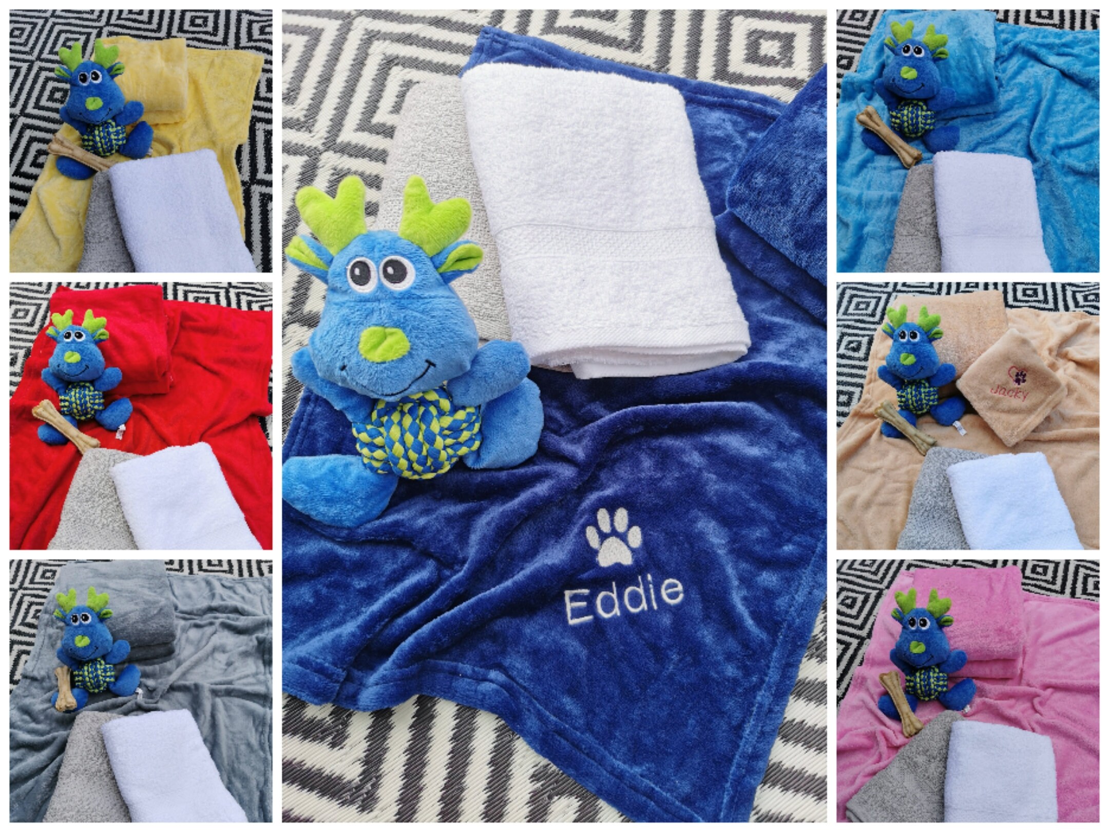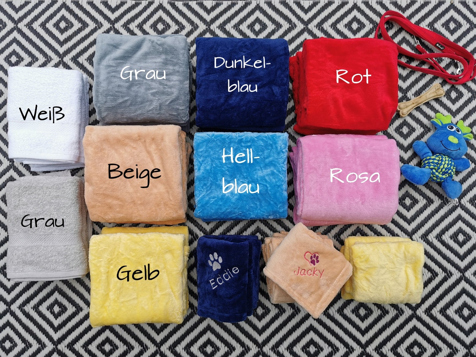 SET Personalized Dog Blanket + Towel Embroidery Name Blanket Puppy Starter Set Dog + Cat Blankets, Animals, 9 Colors, 70 x 100 cm