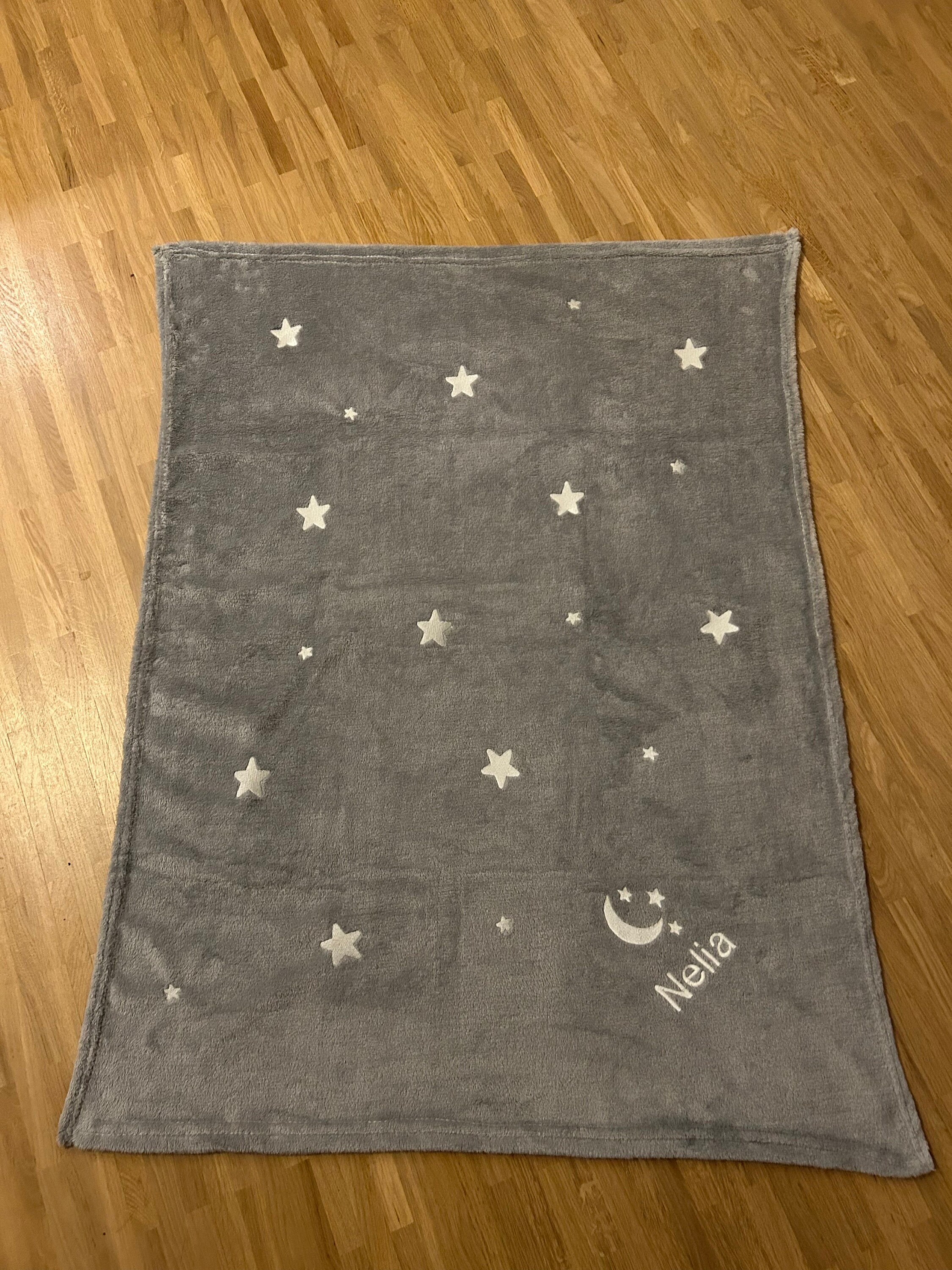 🌟 Discover the magical world of dreams with our glow-in-the-dark blanket for kids. This personalized blanket is not only cuddly soft and embroidered with an enchanting moon and stars motif, but also has a unique feature that makes it an absolute must-have: it glows in the dark!