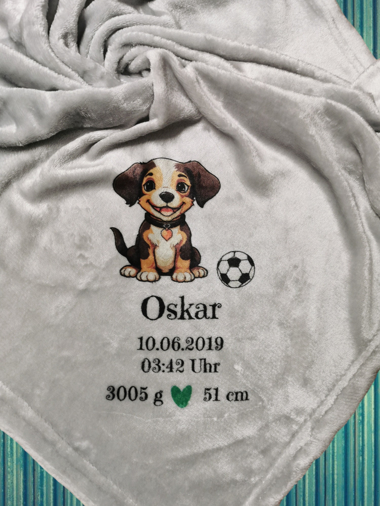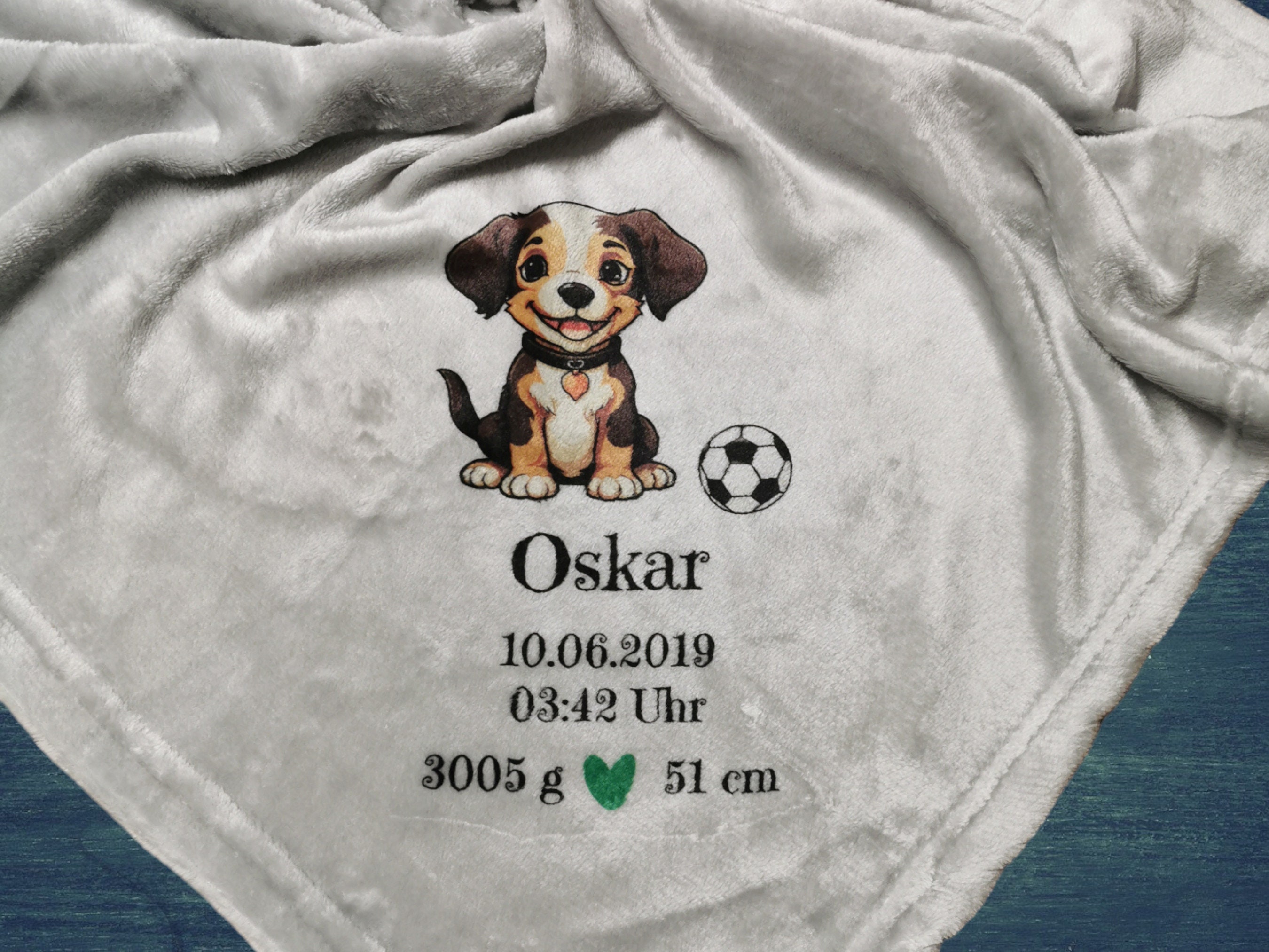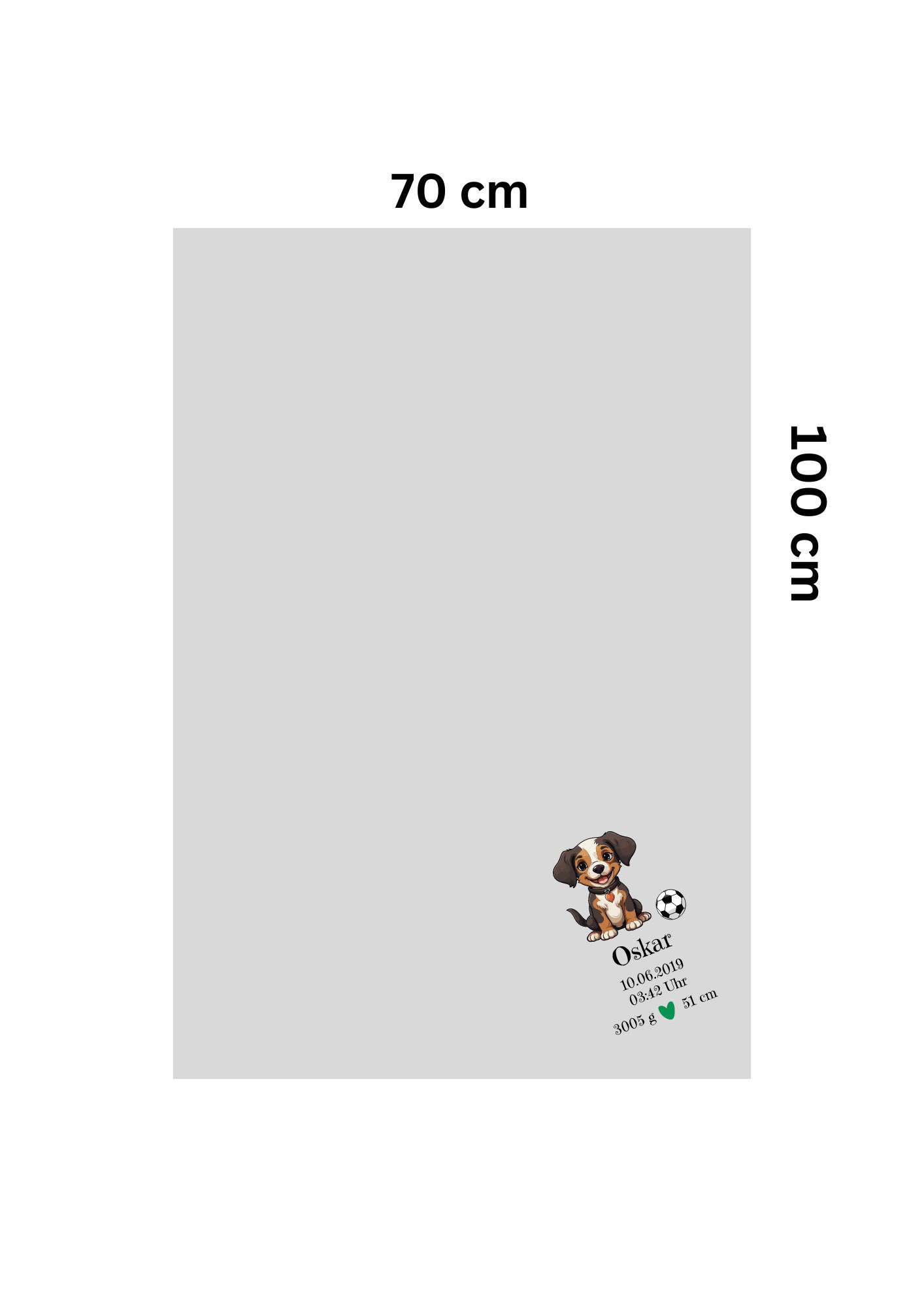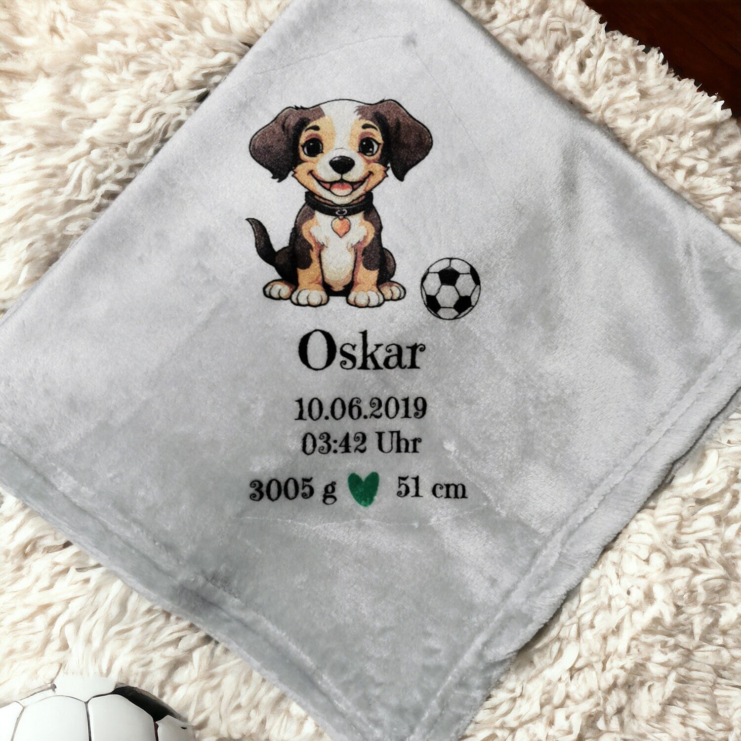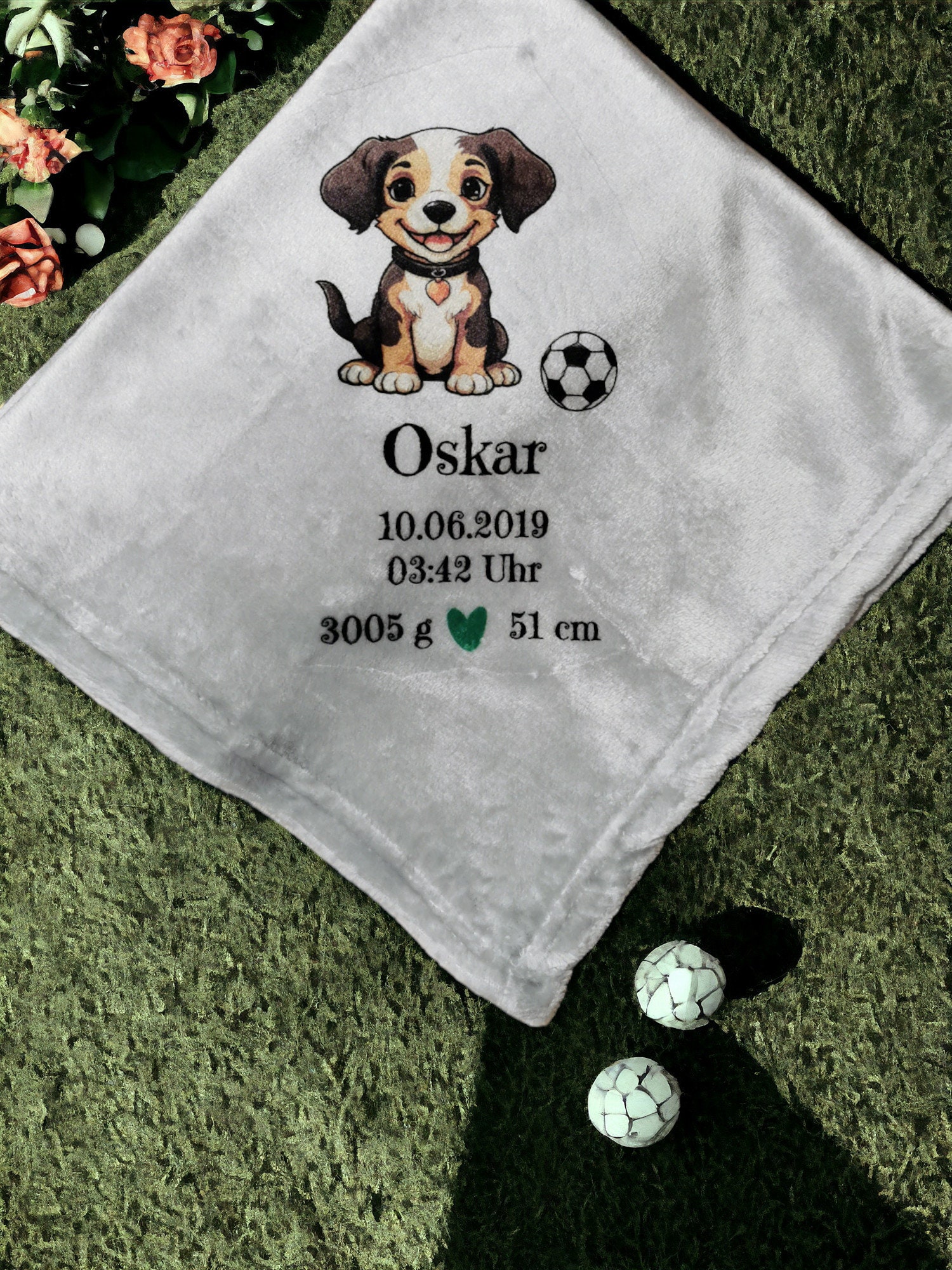 Would you like to give a child a very special gift? Then our personalized blanket is just the thing for you! The blanket is not only soft and cozy, but is also decorated with the child's name, the date of birth and a cute dog motif with a football.