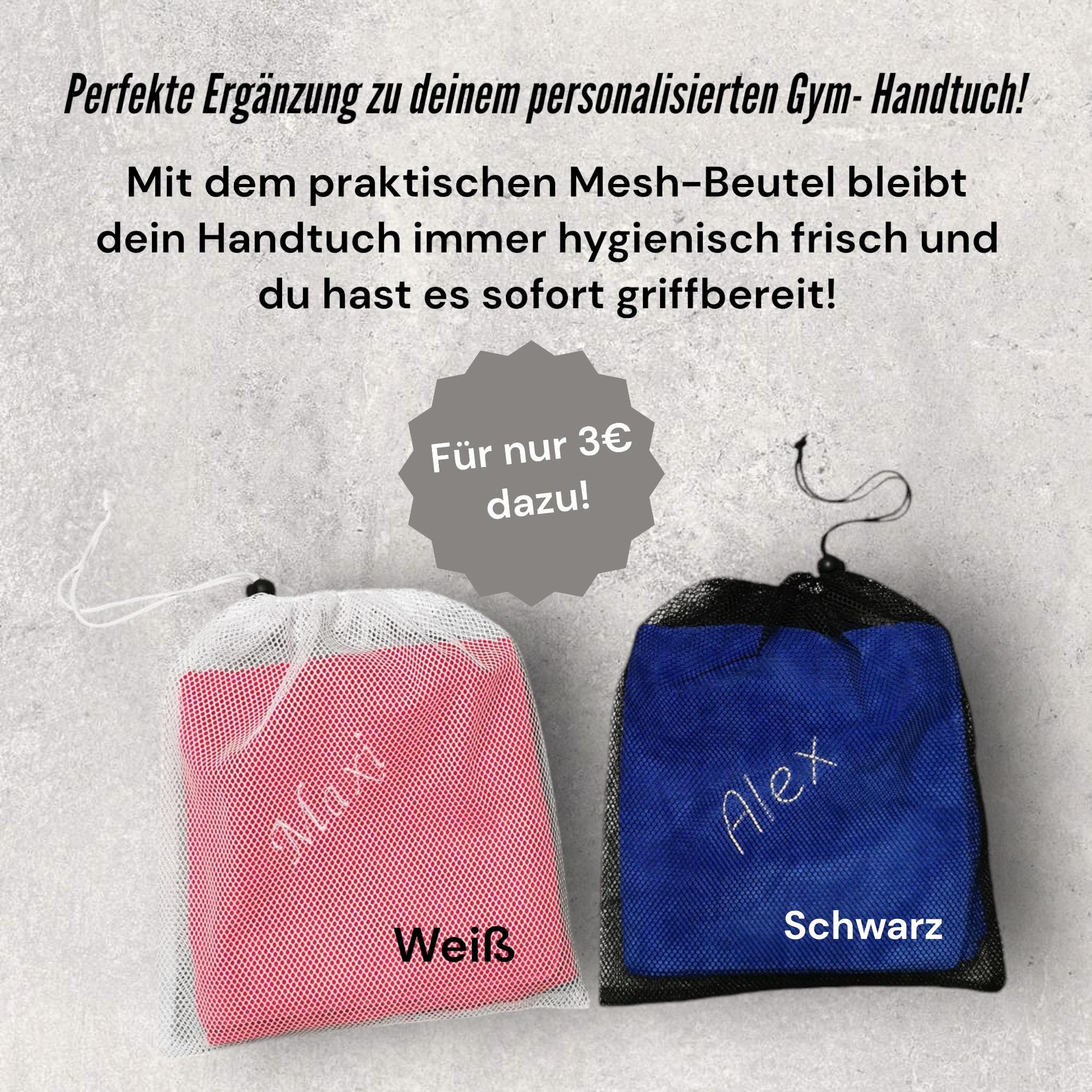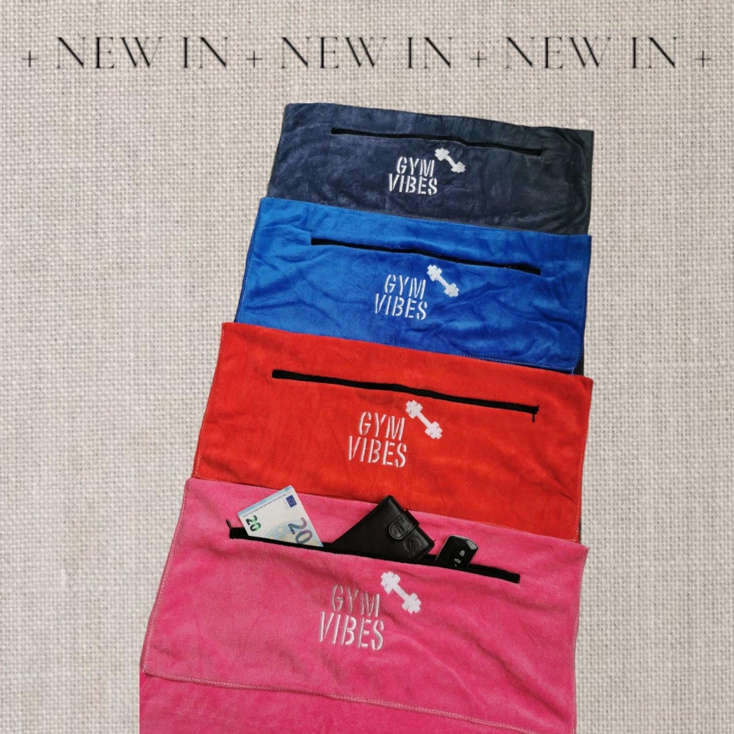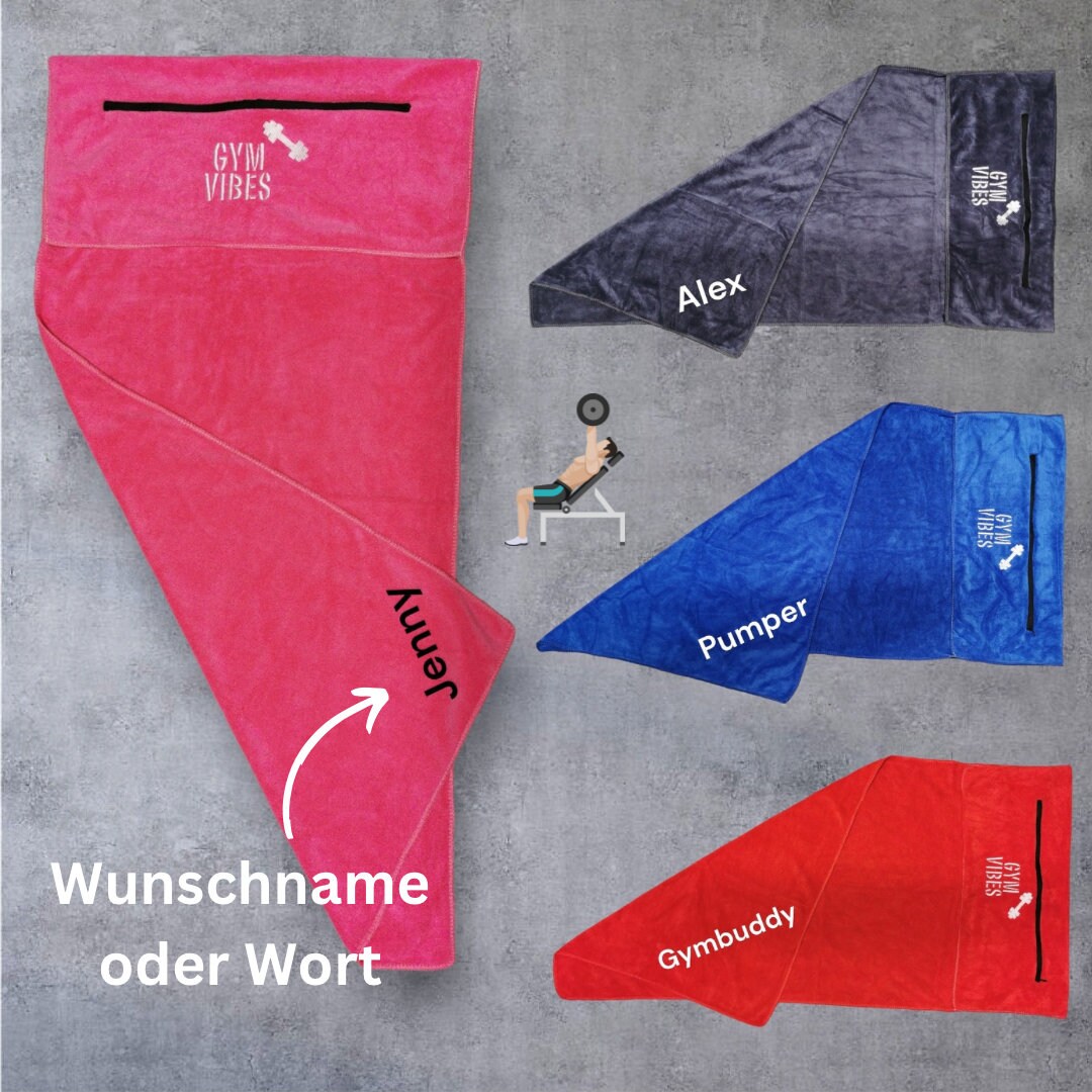 🏋🏼🏆 The practical flap ensures the towel stays in place, allowing you to fully concentrate on your workout. A zippered pocket provides space for your valuables, and the embroidered "GYM VIBES" motif featuring a small dumbbell gives the towel a cool, sporty touch. You can also have your name or a word embroidered to personalize the towel.