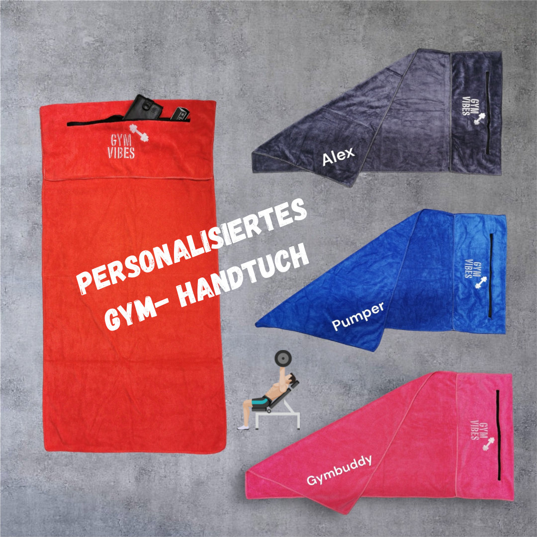 🏋🏼🏆 The practical flap ensures the towel stays in place, allowing you to fully concentrate on your workout. A zippered pocket provides space for your valuables, and the embroidered "GYM VIBES" motif featuring a small dumbbell gives the towel a cool, sporty touch. You can also have your name or a word embroidered to personalize the towel.