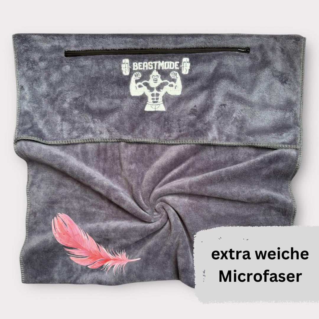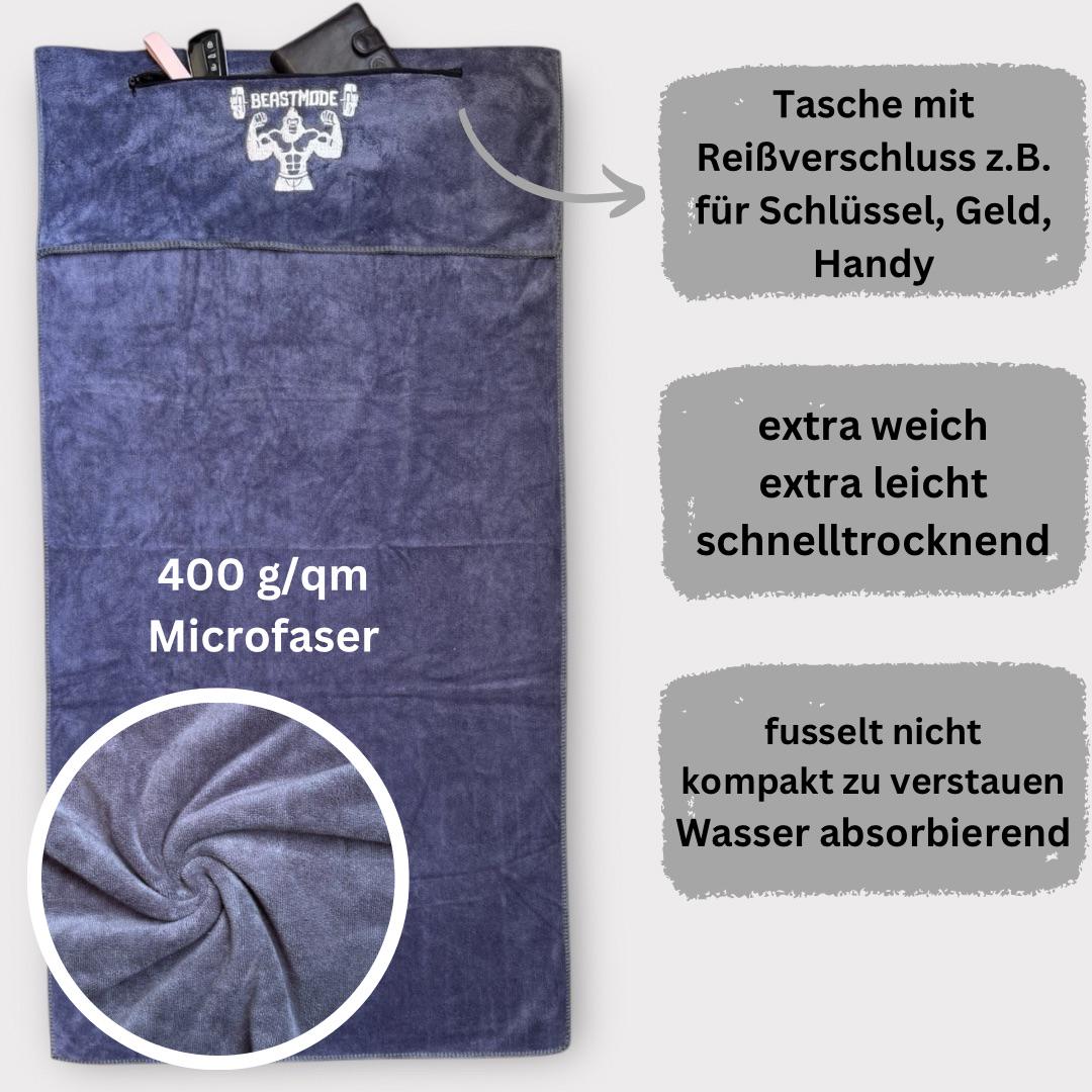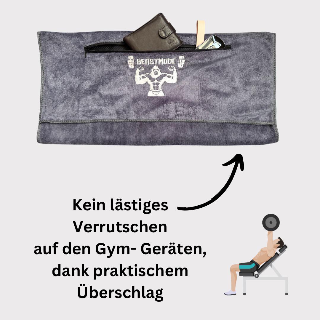 Made from 400gsm microfiber, it's soft, lightweight, quick-drying, and lint-free. The flap ensures a secure hold on fitness equipment, while the practical zippered pocket offers space for your phone, keys, or money.