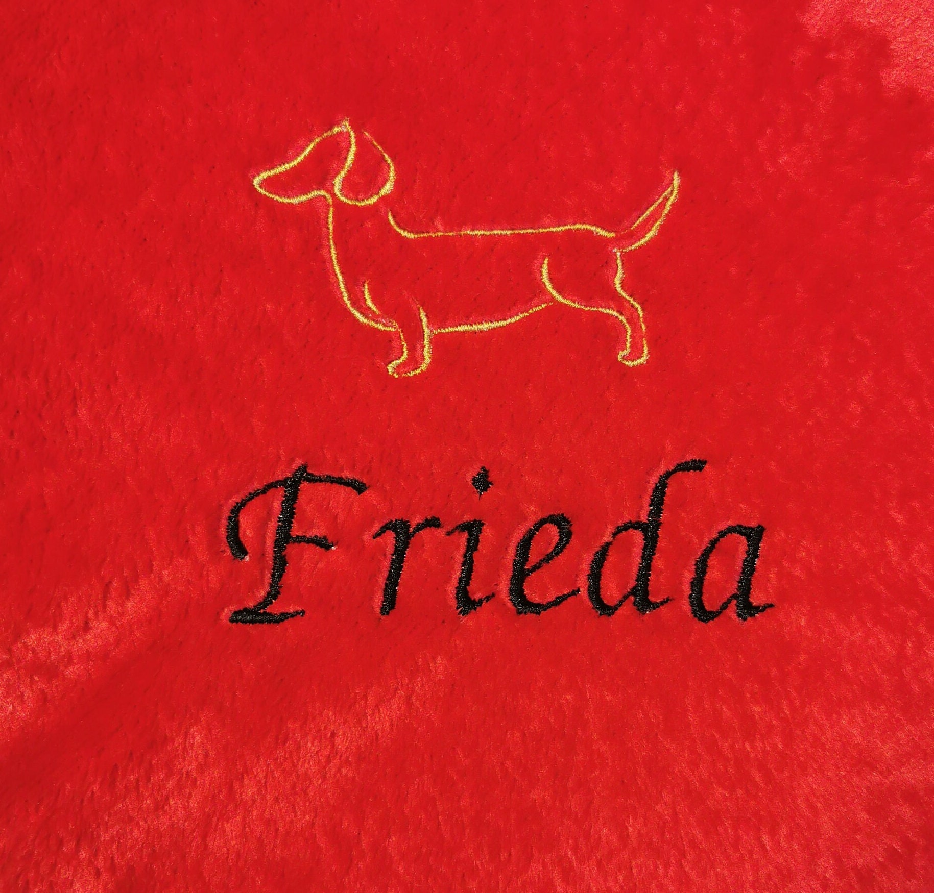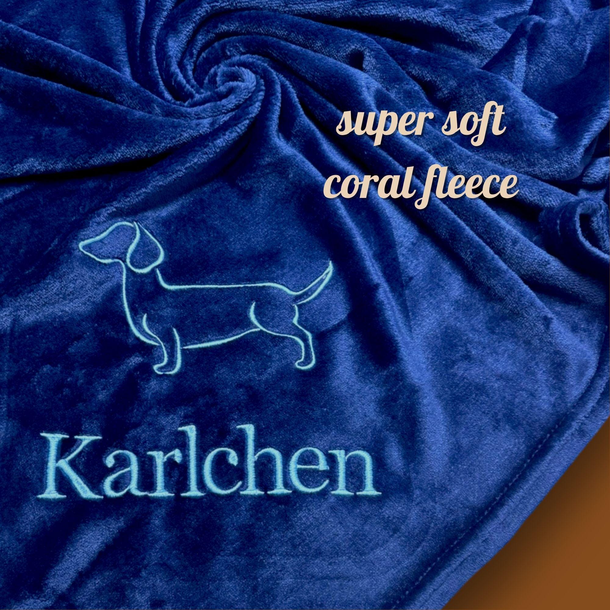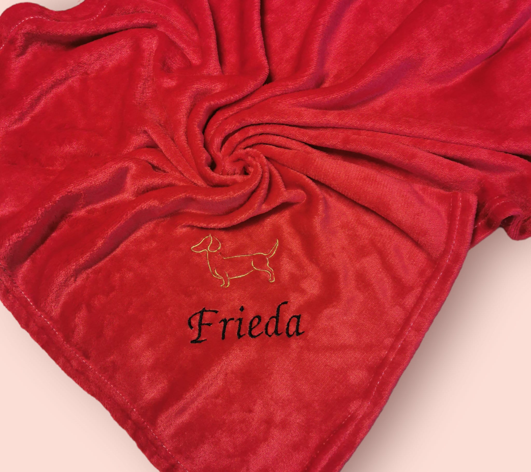 This super soft coral fleece cuddly blanket is individually embroidered with your dog's name – including a cute dachshund motif.
