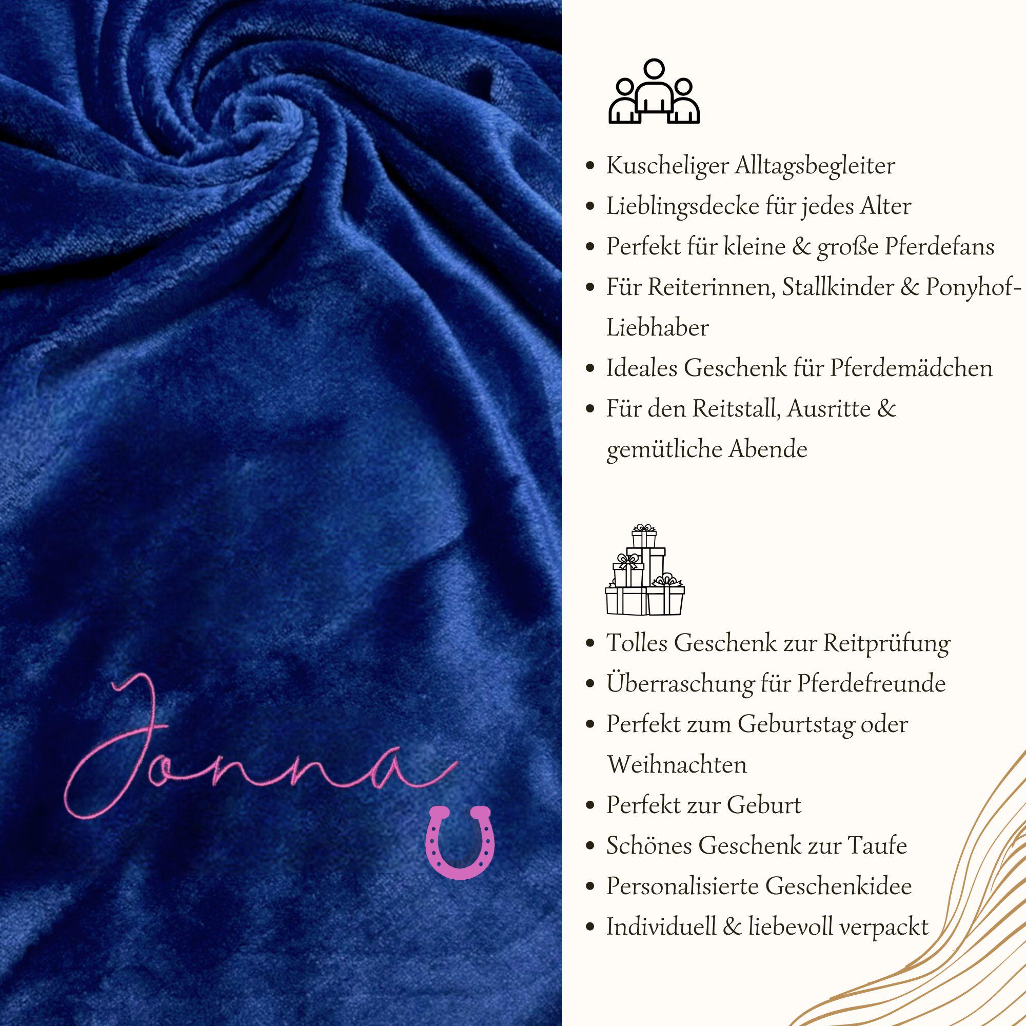 Personalized cuddly blanket with name & horseshoes • Horse gift for girls • Embroidered blanket for babies, children, and adults • 2 sizes • 13 colors